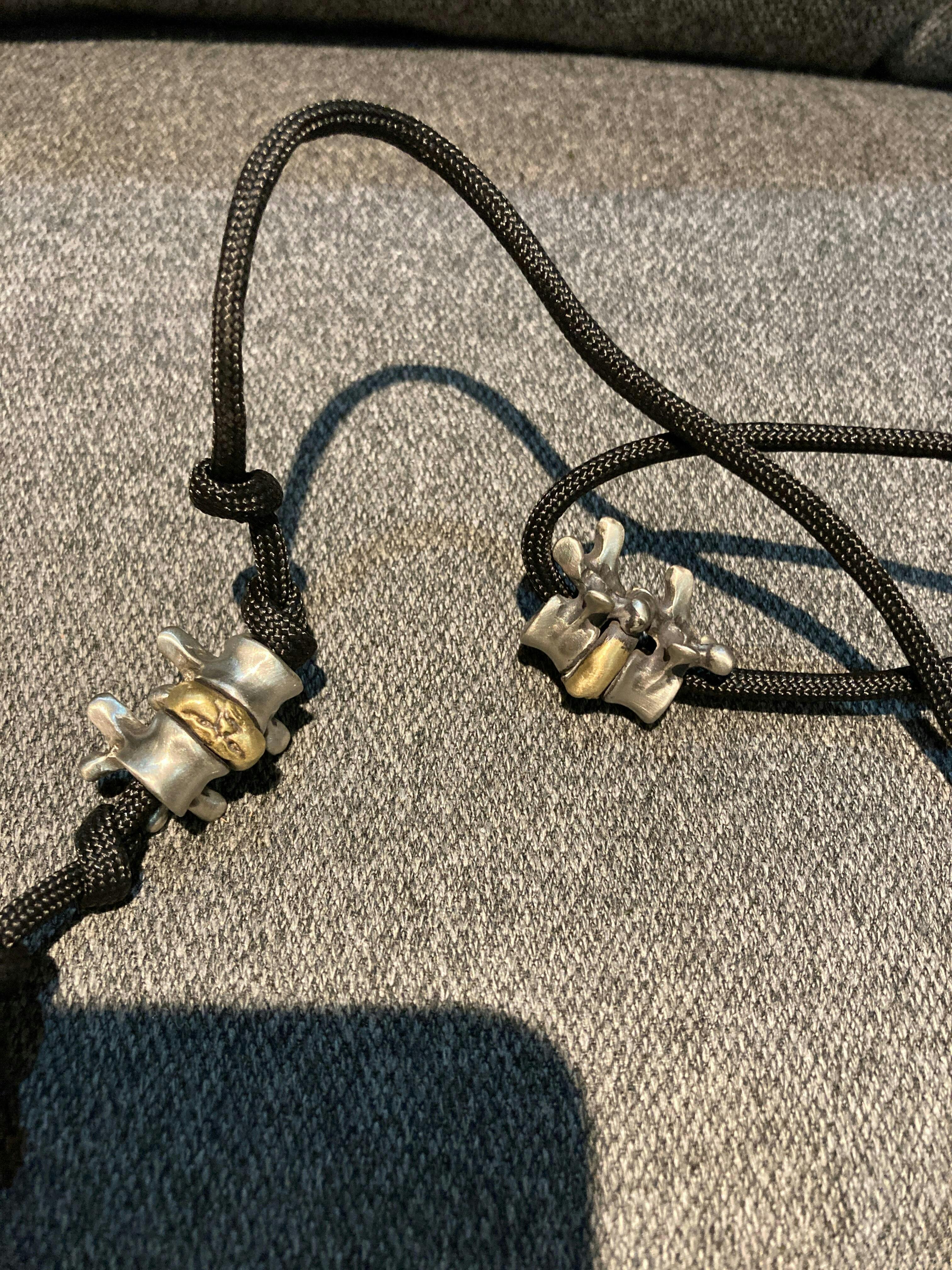 Crafted from solid bronze and white brass, this piece features a mischievous “herniated disc” face wedged between two vertebrae. It's not just jewelry — it’s a statement. A talisman of resilience. A smirking reminder that even under pressure, you hold your ground.